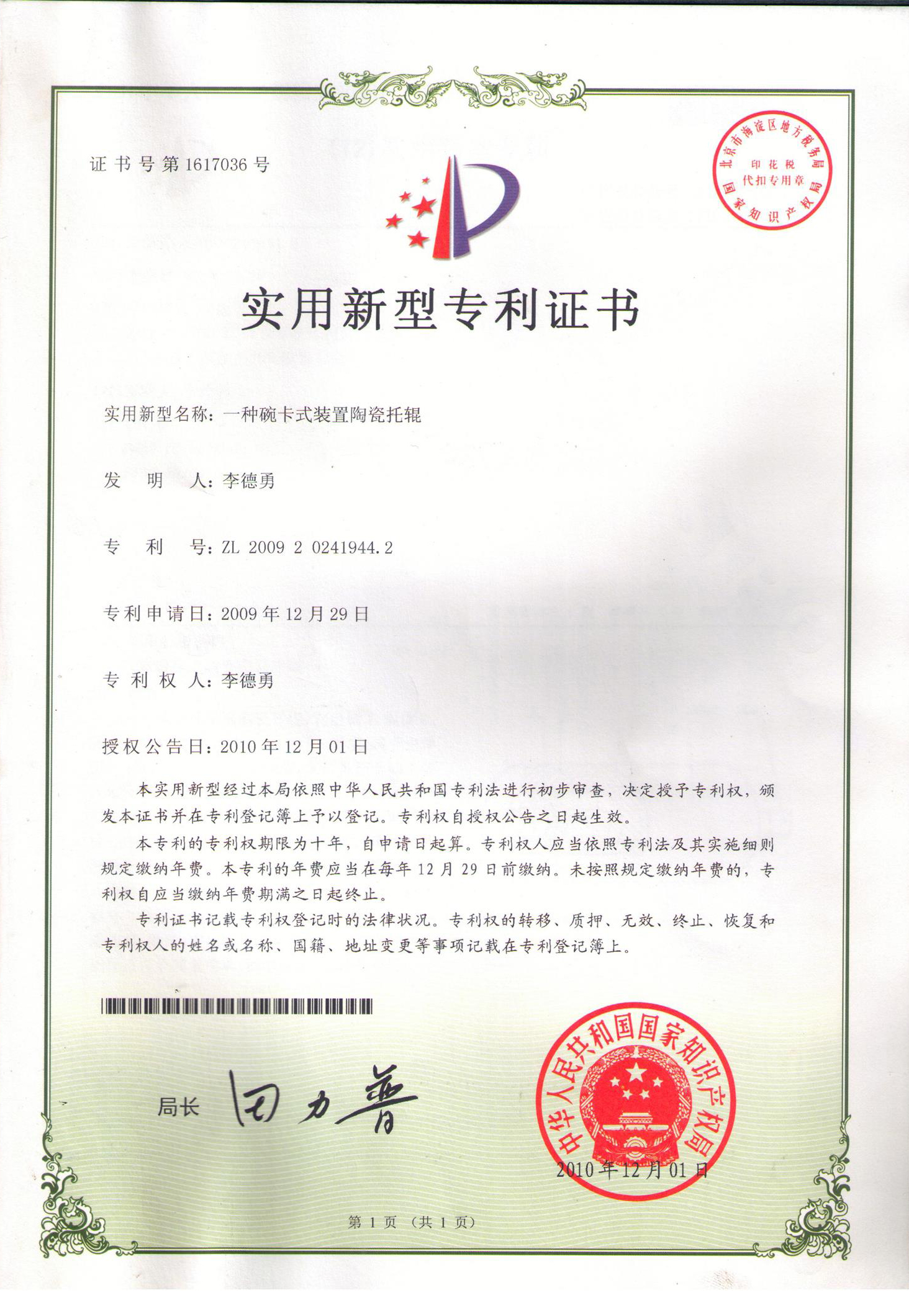 碗卡式耐磨陶瓷托輥專利證書(shū)